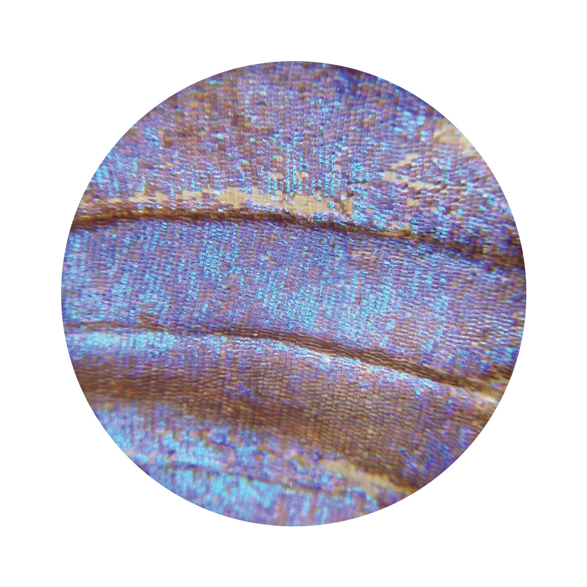 Eine weitere Ebene tiefer, befinden sich Anordnungen, die konstanten Farbgebung trotzen, da Licht durch seine unterschiedliche Wellenlänge innerhalb der Farbe im Skelett des Flügels gebrochen wird in den Zwischenräumen